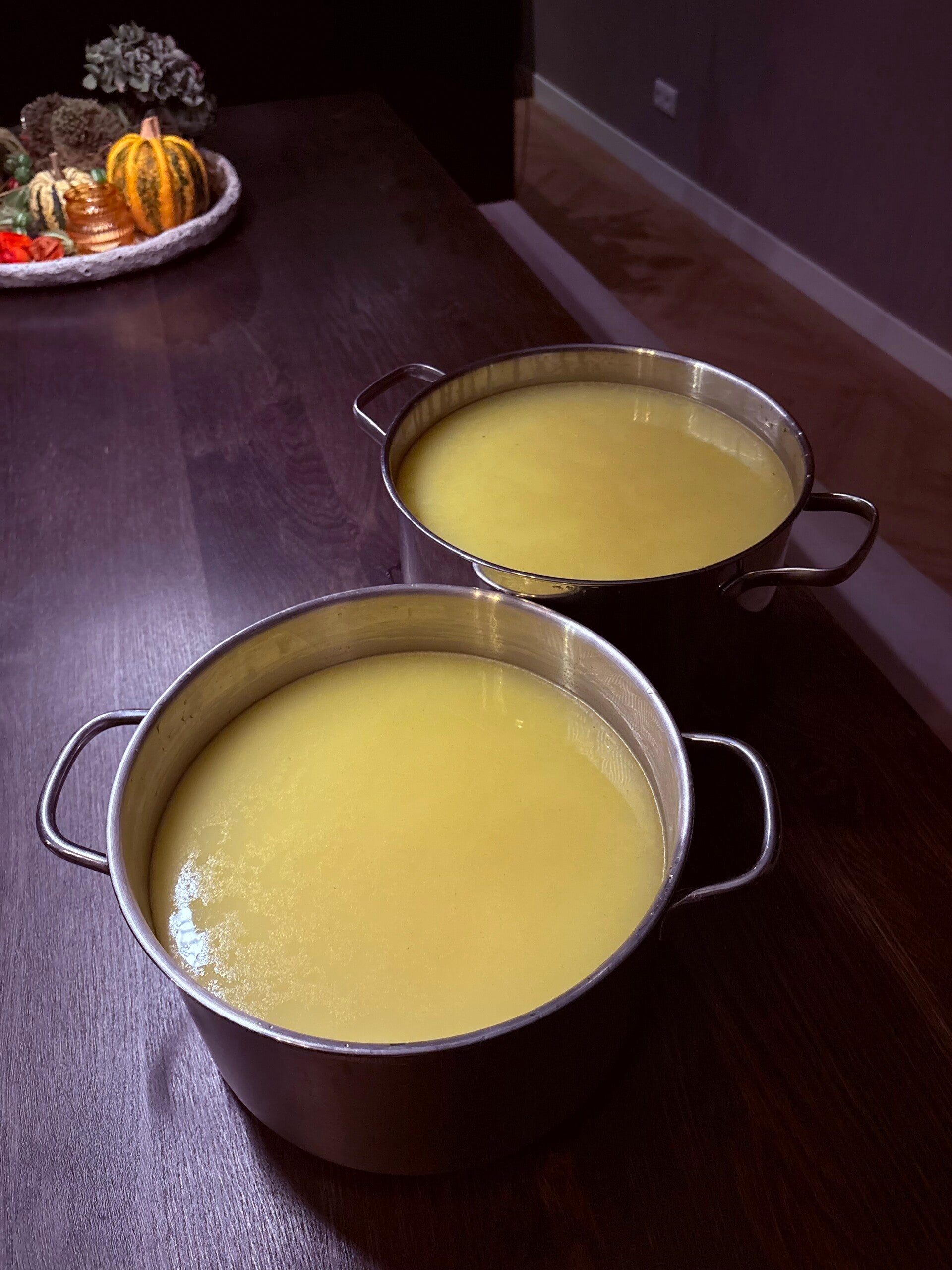 Ruim 60 citroenen heb ik geschild om de citroenschillen vervolgens toe te voegen aan 4 liter pure alcohol. Nadat de smaak van de citroenschillen ruim een maand heeft kunnen infuseren in de alcohol, heeft de alcohol een knalgele kleur en indringende citroengeur gekregen. Vervolgens zijn de citroenschillen er weer uitgezeefd en is er gekookt suikerwater toegevoegd om het mee aan te lengen.